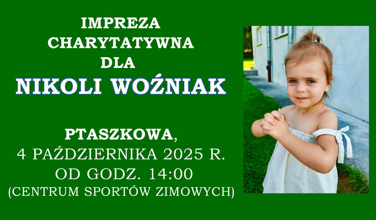 Koszty terapii, która może zahamować rozwój tej nieuleczalnej choroby u 3-letniej Nikoli to około 7 milionów złotych, dlatego prosimy o wspieranie zbiórki na ten cel, a także zachęcamy do udziału w pikniku charytatywnym, który zostanie zorganizowany już w najbliższą sobotę, 4 października br. na terenie Centrum Sportów Zimowych w Ptaszkowej. Organizatorzy przygotowali dla uczestników liczne atrakcje. Start imprezy o godzinie 14:00.