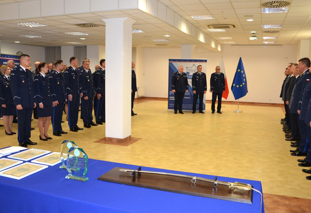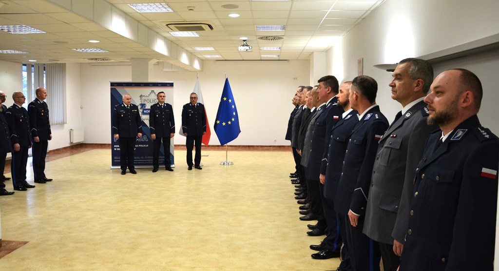 Podczas uroczystej zbiórki szef sądeckich policjantów pogratulował również pięciu funkcjonariuszom, którzy w ostatnim czasie otrzymali rozkazy personalne o powierzeniu obowiązków: Naczelnika Wydziału Kryminalnego – podinsp. Rafałowi Kołodziejczykowi, Naczelnika Wydziału dw. z Przestępczością Przeciwko Mieniu – kom. Dariuszowi Bublewiczowi, Naczelnika Wydziału Prewencji – nadkom. Sebastianowi Lubańskiemu, Zastępcy Naczelnika Wydziału Prewencji – asp. sztab. Zygmuntowi Pasiutowi oraz Zastępcy Komendanta Komisariatu Policji w Grybowie – st. asp. Emanuelowi Leśniakowi. Komendant życzył im wszelkiej pomyślności, a jednocześnie jak najszybszego mianowania na te stanowiska.